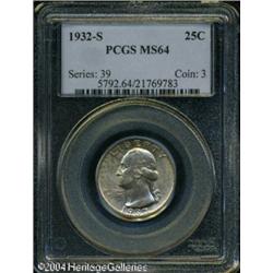 1932-S 25C MS64 PCGS. This key date is toned light <B>1932-S 25C MS64 PCGS.</B></I> This key date is toned light golden-brown, with speckles of olive on the obverse. Well struck, with lustrous surfaces that reveal just a couple of small marks in the obverse field. <BR><BR><B>Important notice:</B> Heritage usually auctions material at the rate of 200-250 lots per hour. On some occasions eBay Live bid software or the Internet may not be able to keep up with the pace of the auction. We recommend placing a realistic absentee bid now as insurance to avoid disappointment. Occasionally the auctioneer may eliminate or reject an eBay Live bid, and the auctioneer may also reopen a lot after the close of the eBay live bidding (usually because we missed an audience bid), and may reject your bid even if it shows you as the winning bidder. By bidding via eBay Live, you agree that Heritage may award the lot to another bidder at its sole discretion under the circumstances described above or any other reasonable circumstances. Since eBay bids are not shown to us until we open the lot on the floor, we treat those bids just like floor bids. In most cases the floor responds before the eBay bid is presented to us, due to Internet lag time, so for consistency we have made it a policy that floor bids are always considered first over tie eBay live bids. Also please note that all Heritage lots purchased through eBay Live carry a 20% Buyer's Premium. Please make sure you read the Terms and Conditions before you bid. This lot is being auctioned in conjunction with a live floor auction by Heritage Galleries & Auctioneers. All final auction and invoice information will be supplied by Heritage Galleries & Auctioneers, and all other information should be considered preliminary. Lot:5985