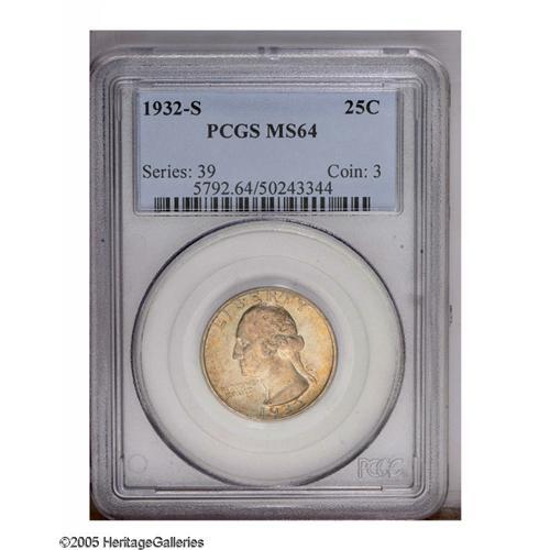<B>1932-S<25C> MS64 PCGS.</B></I> Toned with delicate pastel hues over luster, and very attractive to the eye. Lustrous in the fields, and the strike is reasonably sharp for this issue. One of the key dates to the series, with a small mintage of 408,000 issued right at the depths of the Depression, so few were saved in mint condition. As nice as most collectors can hope to obtain, especially so with so much appeal.