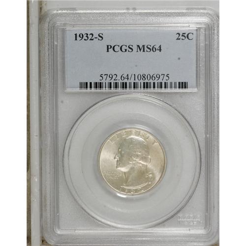 <B>1932-S 25C MS64 PCGS.</B></I> Well struck with creamy satin luster and carefully preserved surfaces. Some faint hints of rose color are noted in the obverse fields of this otherwise silver-gray example. A popular first-year key date in the Washington quarter series.<BR><BR><b>Shipping:</b> Coins & Currency (<a target="_blank" href="http://www.heritageauctions.com/common/shipping.php">view shipping information</a>)