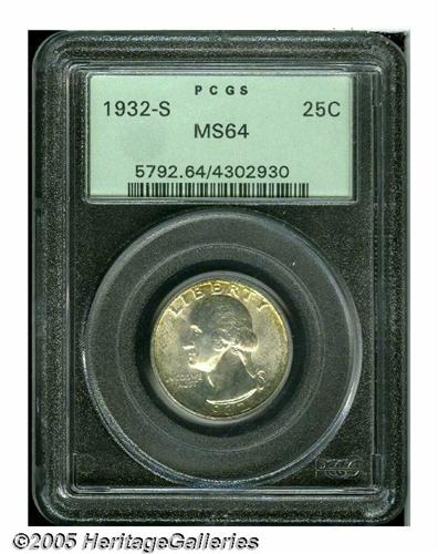 <B>1932-S<25C> MS64 PCGS.</B></I> Well struck with extremely bright luster, attractive light peripheral toning, on both sides, and a minimal number of small surface marks, for a near-Gem. A very impressive example of this desirable key date issue, which has the lowest mintage of the entire series.