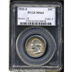 <B>1932-S<25C> MS64 PCGS.</B></I> The lovely forest-green and golden-brown peripheral patina cedes to untoned centers. This well struck and lustrous near-Gem has a splendidly preserved reverse and an attractive obverse. The lowest mintage issue in the series, which initially was intended only as a one-year circulating commemorative to celebrate the 200th anniversary of Washington's birth. <BR><BR><B>Important notice:</B> Heritage usually auctions material at the rate of 200-250 lots per hour. On some occasions eBay Live bid software or the Internet may not be able to keep up with the pace of the auction. We recommend placing a realistic absentee bid now as insurance to avoid disappointment. Occasionally the auctioneer may eliminate or reject an eBay Live bid, and the auctioneer may also reopen a lot after the close of the eBay live bidding (usually because we missed an audience bid), and may reject your bid even if it shows you as the winning bidder. By bidding via eBay Live, you agree that Heritage may award the lot to another bidder at its sole discretion under the circumstances described above or any other reasonable circumstances. Since eBay bids are not shown to us until we open the lot on the floor, we treat those bids just like floor bids. In most cases the floor responds before the eBay bid is presented to us, due to Internet lag time, so for consistency we have made it a policy that floor bids are always considered first over tie eBay live bids. Also please note that all Heritage lots purchased through eBay Live carry a 20% Buyer's Premium. Please make sure you read the Terms and Conditions before you bid. </span></font></tr></table></td></tr></table>