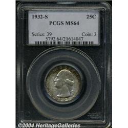 <B>1932-S<25C> MS64 PCGS.</B></I> The technical imperfections that keep this coin from a Gem grade are more than made up for by the originality of the surfaces. Each side is lightly toned in the centers with deep russet patina around the margins. There are several abrasions on the profile of Washington, but the effects are greatly subdued by the original toning. An important early S-mint. <BR><BR><B>Important notice:</B> Heritage usually auctions material at the rate of 200-250 lots per hour. On some occasions eBay Live bid software or the Internet may not be able to keep up with the pace of the auction. We recommend placing a realistic absentee bid now as insurance to avoid disappointment. Occasionally the auctioneer may eliminate or reject an eBay Live bid, and the auctioneer may also reopen a lot after the close of the eBay live bidding (usually because we missed an audience bid), and may reject your bid even if it shows you as the winning bidder. By bidding via eBay Live, you agree that Heritage may award the lot to another bidder at its sole discretion under the circumstances described above or any other reasonable circumstances. Since eBay bids are not shown to us until we open the lot on the floor, we treat those bids just like floor bids. In most cases the floor responds before the eBay bid is presented to us, due to Internet lag time, so for consistency we have made it a policy that floor bids are always considered first over tie eBay live bids. Also please note that all Heritage lots purchased through eBay Live carry a 20% Buyer's Premium. Please make sure you read the Terms and Conditions before you bid. </span></font></tr></table></td></tr></table>