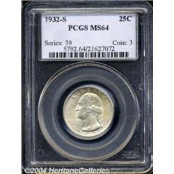 <B>1932-S<25C> MS64 PCGS.</B></I> This key date is toned light golden-brown, with speckles of olive on the obverse. Well struck, with lustrous surfaces that reveal just a couple of small marks on Washington's portrait. <BR><BR><B>Important notice:</B> Heritage usually auctions material at the rate of 200-250 lots per hour. On some occasions eBay Live bid software or the Internet may not be able to keep up with the pace of the auction. We recommend placing a realistic absentee bid now as insurance to avoid disappointment. Occasionally the auctioneer may eliminate or reject an eBay Live bid, and the auctioneer may also reopen a lot after the close of the eBay live bidding (usually because we missed an audience bid), and may reject your bid even if it shows you as the winning bidder. By bidding via eBay Live, you agree that Heritage may award the lot to another bidder at its sole discretion under the circumstances described above or any other reasonable circumstances. Since eBay bids are not shown to us until we open the lot on the floor, we treat those bids just like floor bids. In most cases the floor responds before the eBay bid is presented to us, due to Internet lag time, so for consistency we have made it a policy that floor bids are always considered first over tie eBay live bids. Also please note that all Heritage lots purchased through eBay Live carry a 20% Buyer's Premium. Please make sure you read the Terms and Conditions before you bid. </span></font></tr></table></td></tr></table>