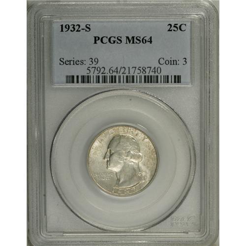 <B>1932-S 25C MS64 PCGS.</B></I> Dappled tan-gold toning enriches this lustrous and unperturbed near-Gem. The lowest mintage business strike of the Washington series, and difficult to find with such pleasing surfaces at the MS64 level. Crisply struck, particularly on the centers of the peripheral legends, which are sometimes blunt.<BR><BR><b>Shipping:</b> Coin/Currency (<a target="_blank" href="http://www.heritageauctions.com/common/shipping.php">view shipping information</a>) <BR><BR><B>Important