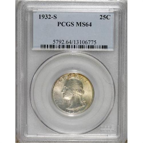<B>1932-S 25C MS64 PCGS.</B></I> Well struck with intense luster and light russet and lemon-gold toning on the upper and right portions of the obverse. A couple of superficial luster grazes are observed, also on the obverse. A solid near-Gem example of this important key date. <BR><BR><b>Shipping:</b> Coins & Currency (<a target="_blank" href="http://www.heritageauctions.com/common/shipping.php">view shipping information</a>)