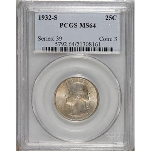<B>1932-S 25C MS64 PCGS.</B></I> Freckles of tan patina grace the gunmetal-gray surfaces of this key-date piece, which has subtle, slightly satiny luster and pleasing detail. Along with its D-mint counterpart, the 1932-S ranks among the most valuable Washington quarters.<BR><BR><b>Shipping:</b> Coins & Currency (<a target="_blank" href="http://www.heritageauctions.com/common/shipping.php">view shipping information</a>)