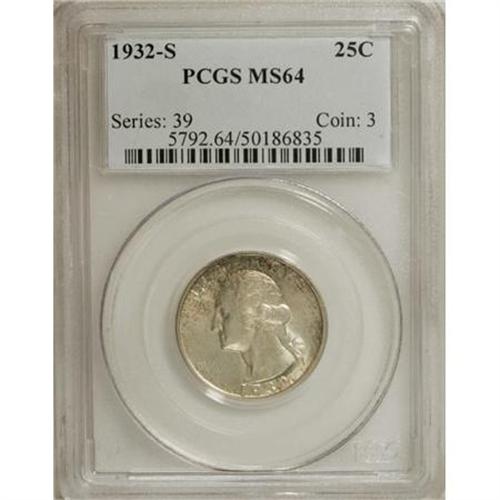 <B>1932-S 25C MS64 PCGS.</B></I> As a one-off commemorative issue of 408,000 pieces, the 1932-S Washington quarter would attract little attention today, but with the continuation of the design, it is a well-known key issue instead. This near-Gem offers powerful luster with speckled sage and violet patina at the margins, thickest at the upper obverse.<BR><BR><B>Coin Engraver:</B> John Flanagan<BR><BR><b>Shipping:</b> Coins & Currency (<a target="_blank" href="http://www.heritageauctions.com/common/shipping.php">view shipping information</a>\)