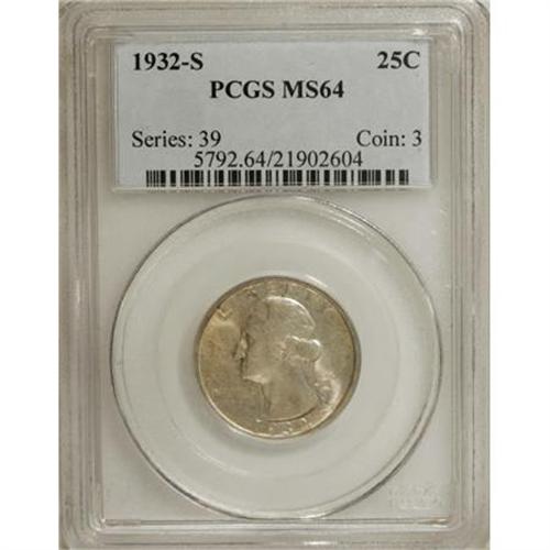 <B>1932-S 25C MS64 PCGS.</B></I> Sharply struck and highly lustrous with traces of pale gold color over brilliant silver-white surfaces. A few slight abrasions keep this piece from Gem quality, but it remains an important representative of this first-year key.<BR><BR><B>Coin Engraver:</B> John Flanagan<BR><BR><b>Shipping:</b> Coins & Currency (<a target="_blank" href="http://www.heritageauctions.com/common/shipping.php">view shipping information</a>\)