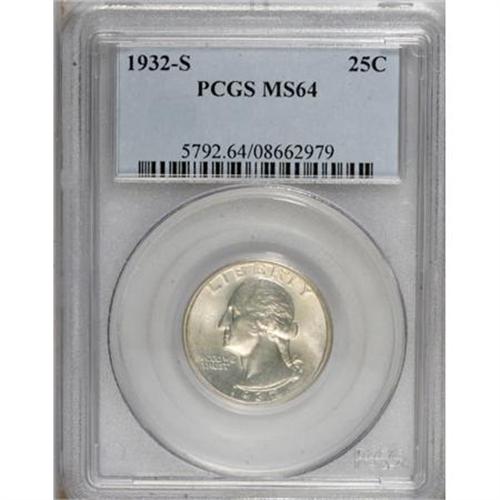 <B>1932-S 25C MS64 PCGS.</B></I> Three mints produced the new Washington quarter design in 1932: Philadelphia, Denver, and San Francisco. The D-mint and S-mint versions have been key issues ever since, with mintages of 436,800 and 408,000 pieces, respectively; while the Philadelphia Mint struck more than 5.4 million coins. Well struck and carefully preserved, this near-Gem shows a trace amount of milky patina and a few trivial nicks on each side. <BR><BR><B>Coin Engraver:</B> John Flanagan<BR><BR><b>Shipping:</b> Coins & Currency (<a target="_blank" href="http://www.heritageauctions.com/common/shipping.php">view shipping information</a>)