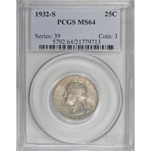 <B>1932-S 25C MS64 PCGS.</B></I> Delicate gold and amber patina graces the otherwise silver-white surfaces of this softly lustrous, attractive Choice piece. Pleasingly detailed for the issue with only a few faint, scattered flaws that account for the grade.<BR><BR><B>Coin Engraver:</B> John Flanagan<BR><BR><b>Shipping:</b> Coins & Currency (<a target="_blank" href="http://www.heritageauctions.com/common/shipping.php">view shipping information</a>)