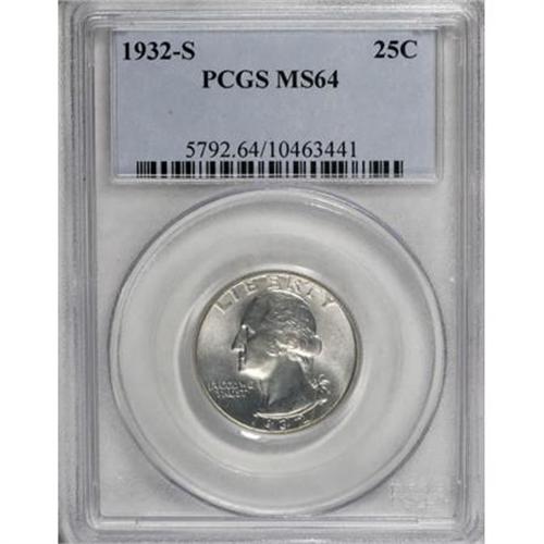 <B>1932-S 25C MS64 PCGS.</B></I> While Choice pieces are available, Gems are much more elusive, with just 91 examples graded MS65 or better by PCGS (10/07). This strongly lustrous, minimally toned example offers excellent detail and visual appeal. The surfaces fall just shy of a finer designation.<BR><BR><B>Coin Engraver:</B> John Flanagan<BR><BR><b>Shipping:</b> Coins & Currency (<a target="_blank" href="http://www.heritageauctions.com/common/shipping.php">view shipping information</a>)