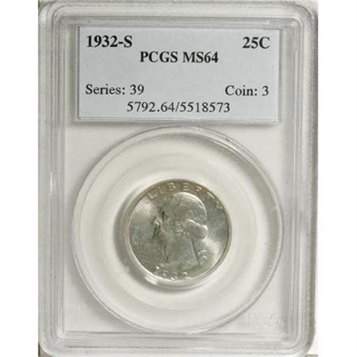 <B>1932-S 25C MS64 PCGS.</B></I> An especially bold and satiny example, untoned save for a few scattered flecks of reddish-brown color on the left side of the obverse. Only a handful of faint flaws keep this attractive key from the coveted Gem grade.<BR><BR><B>Coin Engraver:</B> John Flanagan<BR><BR><b>Shipping:</b> Coins & Currency (<a target="_blank" href="http://www.heritageauctions.com/common/shipping.php">view shipping information</a>)