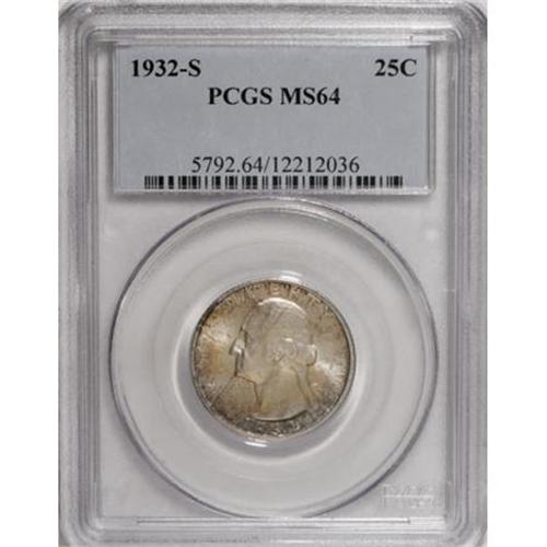 <B>1932-S 25C MS64 PCGS.</B></I> Golden toning with hints of peach and blue drapes shining surfaces on this near-Gem. Pleasingly preserved and delightful, a great example of this coveted Washington quarter key.<BR><I>From The John Stimson, Sr. Collection, Part Two.</B></I><BR><BR><B>Coin Engraver:</B> John Flanagan<BR><BR><b>Shipping:</b> Coins & Currency (<a target="_blank" href="http://www.heritageauctions.com/common/shipping.php">view shipping information</a>)