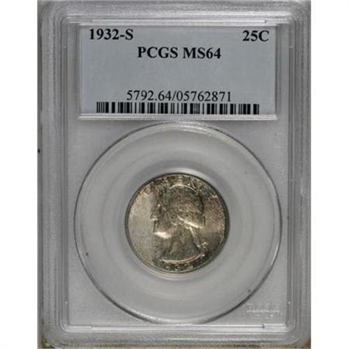<B>1932-S 25C MS64 PCGS.</B></I> An attractive Choice example of this popular Washington quarter key, primarily silver-gray with occasional streaks of gold and blue. Strong luster and undeniable eye appeal.<BR><BR><B>Coin Engraver:</B> John Flanagan<BR><BR><b>Shipping:</b> Coins & Currency (<a target="_blank" href="http://www.heritageauctions.com/common/shipping.php">view shipping information</a>)