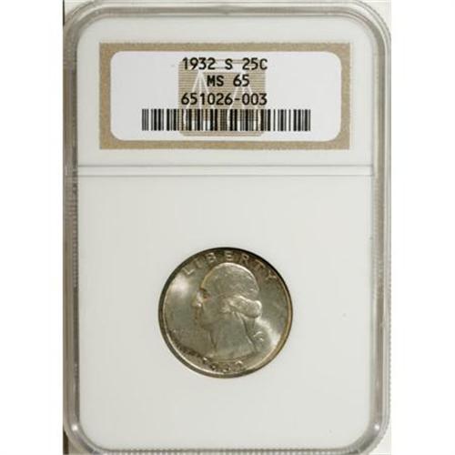 <B>1932-S 25C MS65 NGC.</B></I> 1932 was the first year of the Washington quarter series. The Denver and San Francisco Mints only produced 436,800 and 408,000 pieces, respectively, making those the two key dates in the popular, long-lived series. A slight degree of gray-brown color rests near the peripheries of this lustrous example. A grade-defining mark is barely visible in the right obverse field. Census: 54 in 65, 5 finer (8/07). <BR><BR><B>Coin Engraver:</B> John Flanagan<BR><BR><b>Shipping:</b> Coins & Currency (<a target="_blank" href="http://www.heritageauctions.com/common/shipping.php">view shipping information</a>)