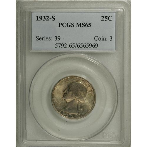 <B>1932-S 25C MS65 PCGS.</B></I> Mottled chestnut-gold and battleship-gray toning drapes this lustrous and splendidly smooth key date quarter. The strike is precise across both the legends and devices. 1932 was the only year for the series that exclusively used the Light Motto hub. Population: 94 in 65, 4 finer (1/07).<BR><BR><b>Shipping:</b> Coins & Currency (<a target="_blank" href="http://www.heritageauctions.com/common/shipping.php">view shipping information</a>)