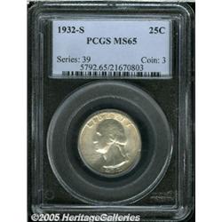 <B>1932-S 25C MS65 PCGS.</B></I> The first-year 1932-S boasts the lowest mintage (408,000 pieces) in the business strike Washington Quarter series. Examples are prized at all grades levels, but circulated coins are usually available with patience. Collectors who seek a Mint State representative will have to exercise more patience, and even then their labors will usually net a coin that grades only BU. This is an impressive Gem that stands head and shoulders above most 1932-S Quarters that we have offered in recent memory. The luster is full and frosty beneath pale golden and champagne-tan iridescence. A sharply struck, blemish-free coin. Population: 76 in 65, 4 finer (2/05).