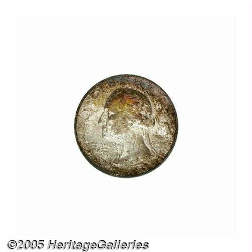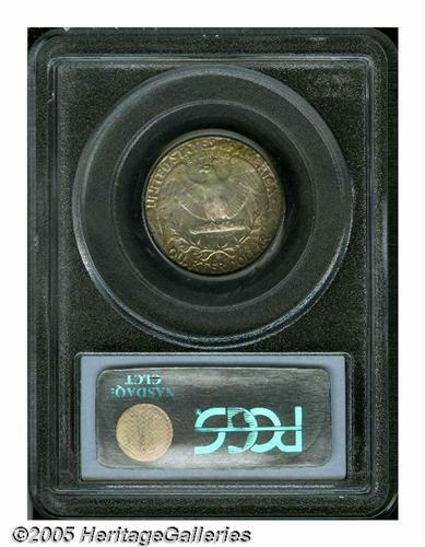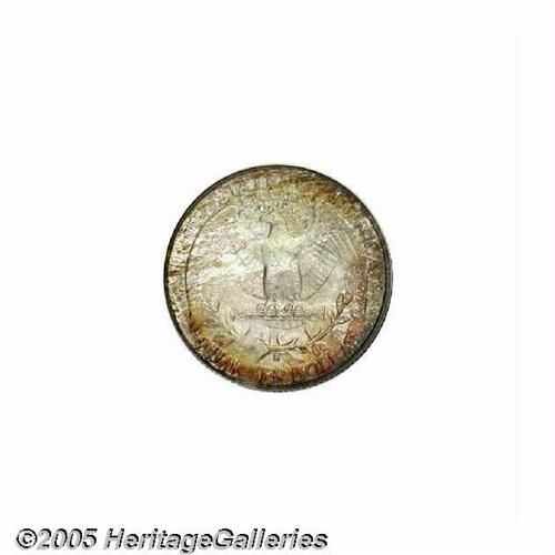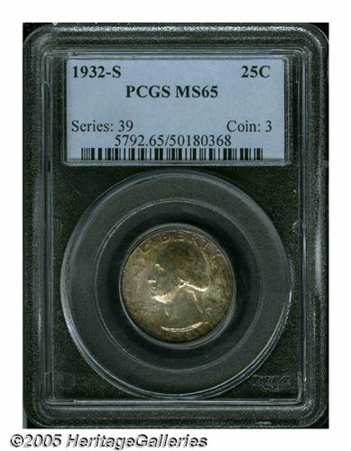 <B>1932-S<25C> MS65 PCGS.</B></I> Vividly and warmly toned in mottled hues of blue, pink, and gold, with some hints of original mint brilliance still visible in the central areas. The 1932-S has long been celebrated as one of the most desirable issues in the Washington quarter series, second only to the eagerly-sought 1932-D. Examples grading MS65 or better are especially desirable.