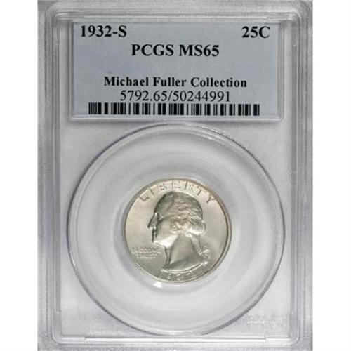 <B>1932-S 25C MS65 PCGS.</B></I> This key-date quarter dollar displays a thin veneer of champagne-gold patina that overlays highly lustrous surfaces. The design elements are well brought up, including nice definition in Washington's hair and on the eagle's breast feathers. A few minute marks on Washington's cheek and jaw are inoffensive, and consistent with the grade level. Population: 88 in 65, 4 finer (10/07).<BR><I>From The Michael Fuller Collection.</B></I><BR><BR><B>Coin Engraver:</B> John Flanagan<BR><BR><b>Shipping:</b> Coins & Currency (<a target="_blank" href="http://www.heritageauctions.com/common/shipping.php">view shipping information</a>)