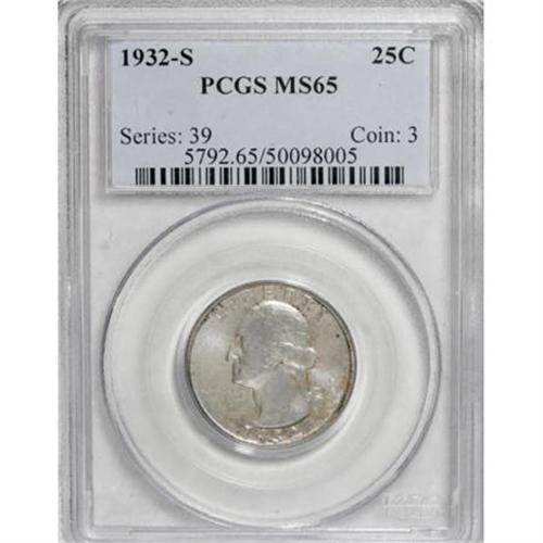 <B>1932-S 25C MS65 PCGS.</B></I> Boldly struck and highly lustrous Gems of this key date are not often encountered, and finer quality representatives rank among the rarest of all Washington quarter issues. The surfaces are predominately brilliant with speckled gold and iridescent toning on each side. Population: 88 in 65, 4 finer (1/08).<BR><I>From The Southwest Collection.</B></I><BR><BR><B>Coin Engraver:</B> John Flanagan<BR><BR><b>Shipping:</b> Coins & Currency (<a target="_blank" href="http://www.heritageauctions.com/common/shipping.php">view shipping information</a>)