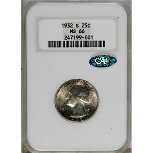 <B>1932-S 25C MS66 NGC. CAC.</B></I> The 1932-D and 1932-S Washington quarters are the classic key-date issues in the series, elusive but necessary to complete a collection. This piece is amazing with remarkable satin luster and exceptional design definition. Both sides are deep golden-brown, accented by lighter gold and iridescent toning. Seldom does an opportunity appear to acquire an exceptional Premium Gem 1932-S quarter. In fact, the combined population of NGC and PCGS totals just nine examples at this grade, and none that are any finer. Census: 5 in 66, 0 finer (1/08).<BR><BR><B>Coin Engraver:</B> John Flanagan<BR><BR><b>Shipping:</b> Coins & Currency (<a target="_blank" href="http://www.heritageauctions.com/common/shipping.php">view shipping information</a>)