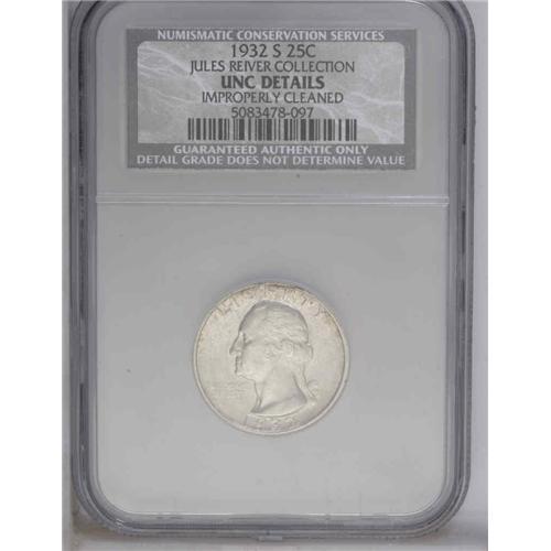 1932-S 25C Unc Details, Improperly Cleaned, NCS. This 1932-S[25C]--Improperly Cleaned--NCS. Unc. Det