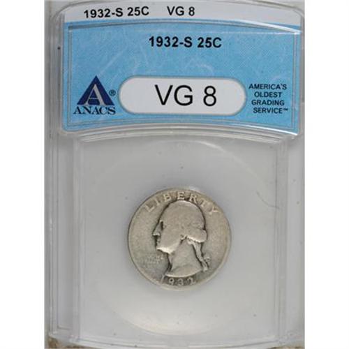 <B>1932-S 25C VG8 ANACS.</B></I> NGC Census: (13/2340). PCGS Population (25/3415). Mintage: 408,000. Numismedia Wsl. Price for NGC/PCGS coin in VG8 : $148. (#5792)<BR><BR><B>Coin Engraver:</B> John Flanagan<BR><BR><b>Shipping:</b> Coins & Currency (<a target="_blank" href="http://www.heritageauctions.com/common/shipping.php">view shipping information</a>)
