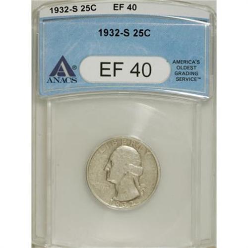 <B>1932-S 25C XF40 ANACS.</B></I> NGC Census: (35/2182). PCGS Population (55/3166). Mintage: 408,000. Numismedia Wsl. Price for NGC/PCGS coin in XF40: $200. (#5792)<BR><BR><B>Coin Engraver:</B> John Flanagan<BR><BR><b>Shipping:</b> Coins & Currency (<a target="_blank" href="http://www.heritageauctions.com/common/shipping.php">view shipping information</a>)