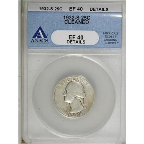<B>1932-S 25C --Cleaned--ANACS. XF40 Details.</B></I> NGC Census: (36/2232). PCGS Population (59/3276). Mintage: 408,000. Numismedia Wsl. Price for NGC/PCGS coin in XF40: $200. (#5792)<BR><BR><B>Coin Engraver:</B> John Flanagan<BR><BR><b>Shipping:</b> Coins & Currency (<a target="_blank" href="http://www.heritageauctions.com/common/shipping.php">view shipping information</a>)