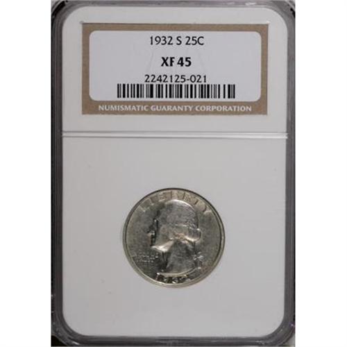<B>1932-S 25C XF45 NGC.</B></I> NGC Census: (90/2143). PCGS Population (118/3176). Mintage: 408,000. Numismedia Wsl. Price for NGC/PCGS coin in XF45: $211. (#5792)<BR><BR><B>Coin Engraver:</B> John Flanagan<BR><BR><b>Shipping:</b> Coins & Currency (<a target="_blank" href="http://www.heritageauctions.com/common/shipping.php">view shipping information</a>)