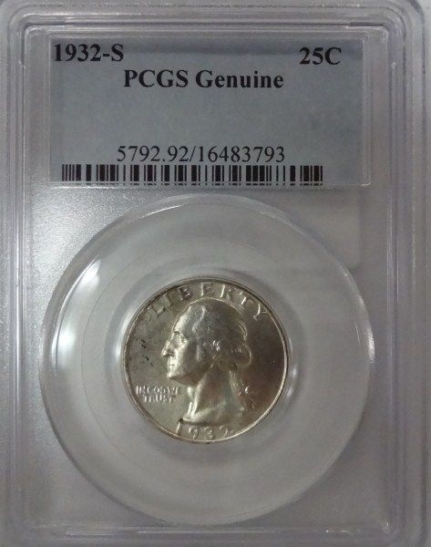 1932-S WASHINGTON QUARTER PCGS GENUINE, SAYS CLEANED, DOES NOT LOOK IT!