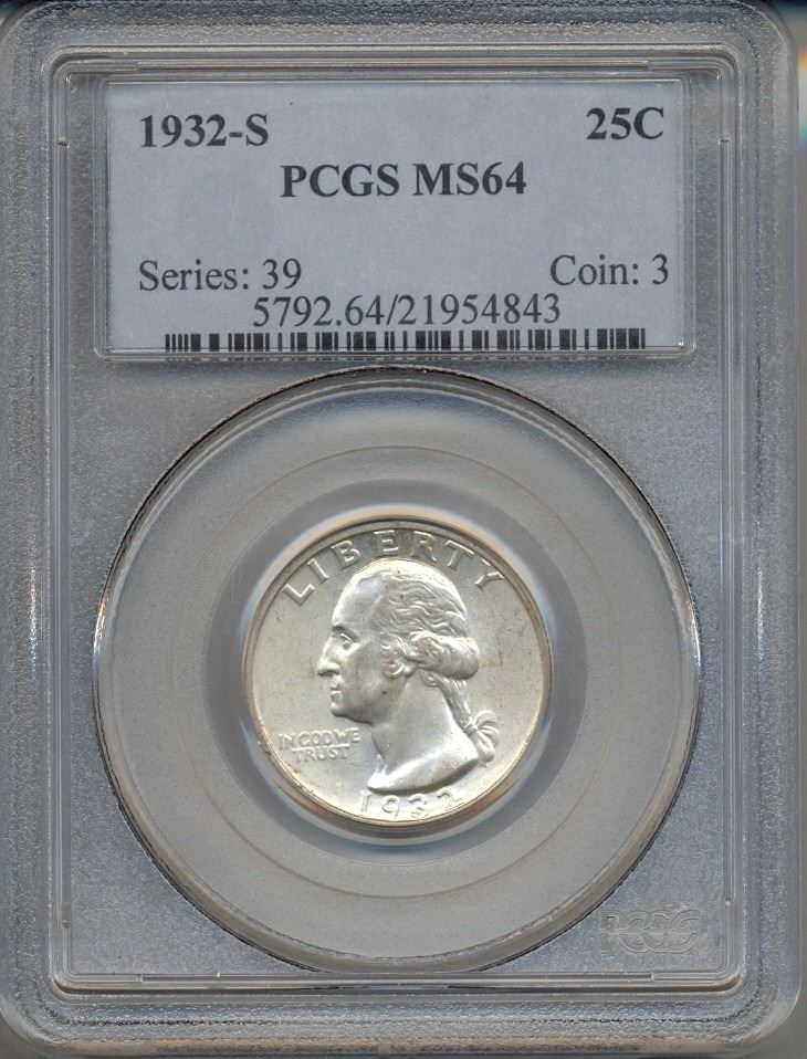 One 1932-S Washington Quarter Coin PCGS MS64.