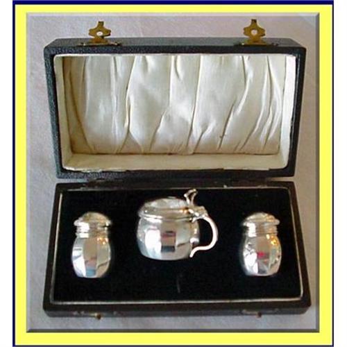 Original leather fitted box with silk and velvet lining. Barrel shaped salt and pepper castors. Lids screw on and off easilly. Salt has dent at top of lid (see 'photos). Mustard is also barrel shaped, but rounder with delicate handle and strong hinged lid. Small dent on lid of mustard. Original blue glass liner in good condition.