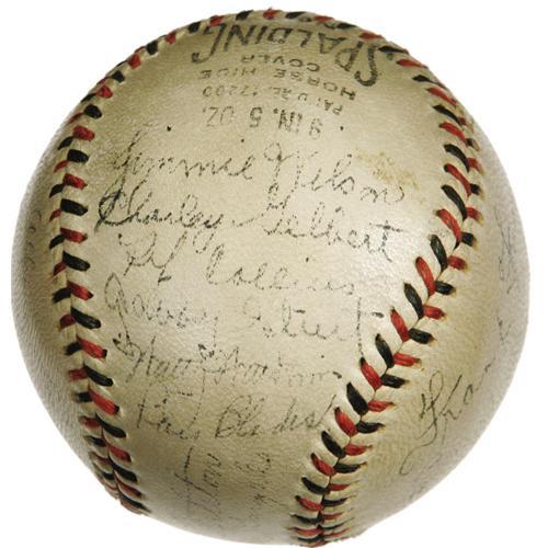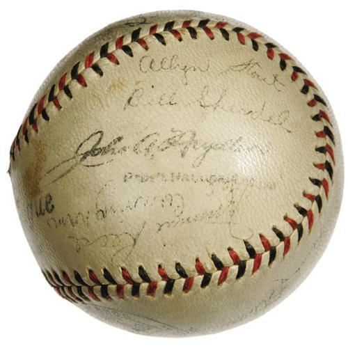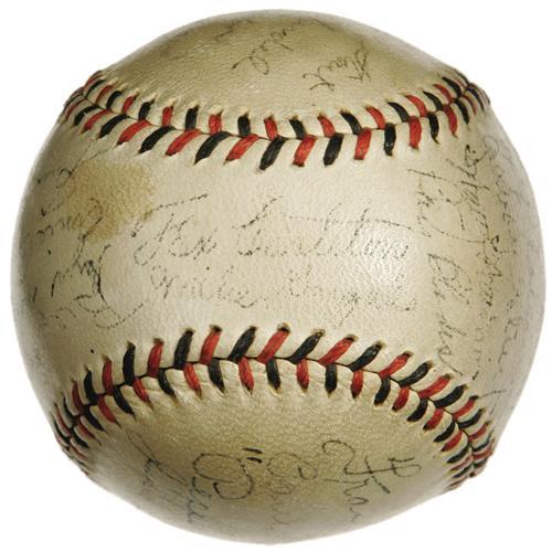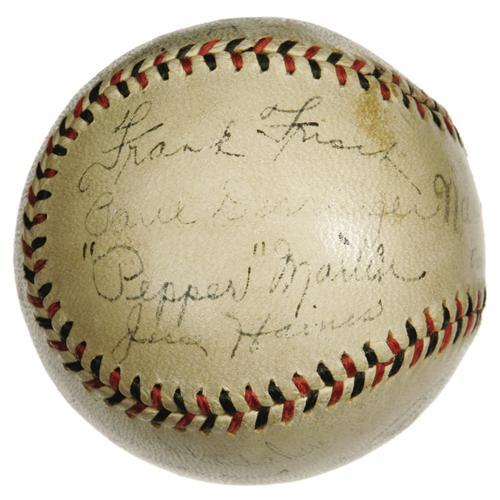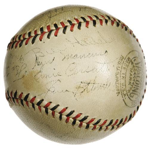 <B>1932 St. Louis Cardinals Team Signed Baseball.</B></I> After two consecutive National League flags, this team inexplicably dropped to a sixth place finish, though they'd soon bounce back to take the Championship in two year's time. Despite their losing ways, the team boasted some top-ranked talent, including Frisch, Haines, Bottomley, Carleton, Orsatti, Martin and more. Twenty autographs are on this ONL (Heydler) ball in total, with all listed names rating 4/10 or better, as does all but a few of the rest. Average is 6/10. <I>LOA from PSA/DNA. LOA from James Spence Authentication.</B></I><BR><BR><b>Shipping:</b> Balls, etc. (<a target="_blank" href="http://www.heritageauctions.com/common/shipping.php">view shipping information</a>)