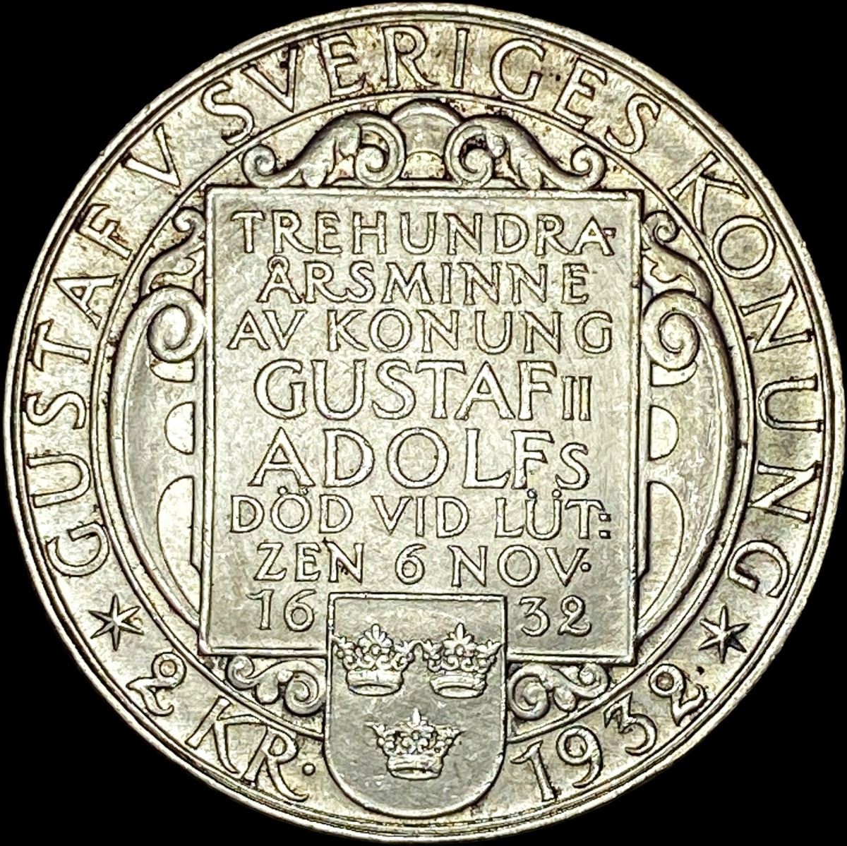 1932 Sweden Gustaf II Adolf Silver 2 Kronor UNCIRCULATED