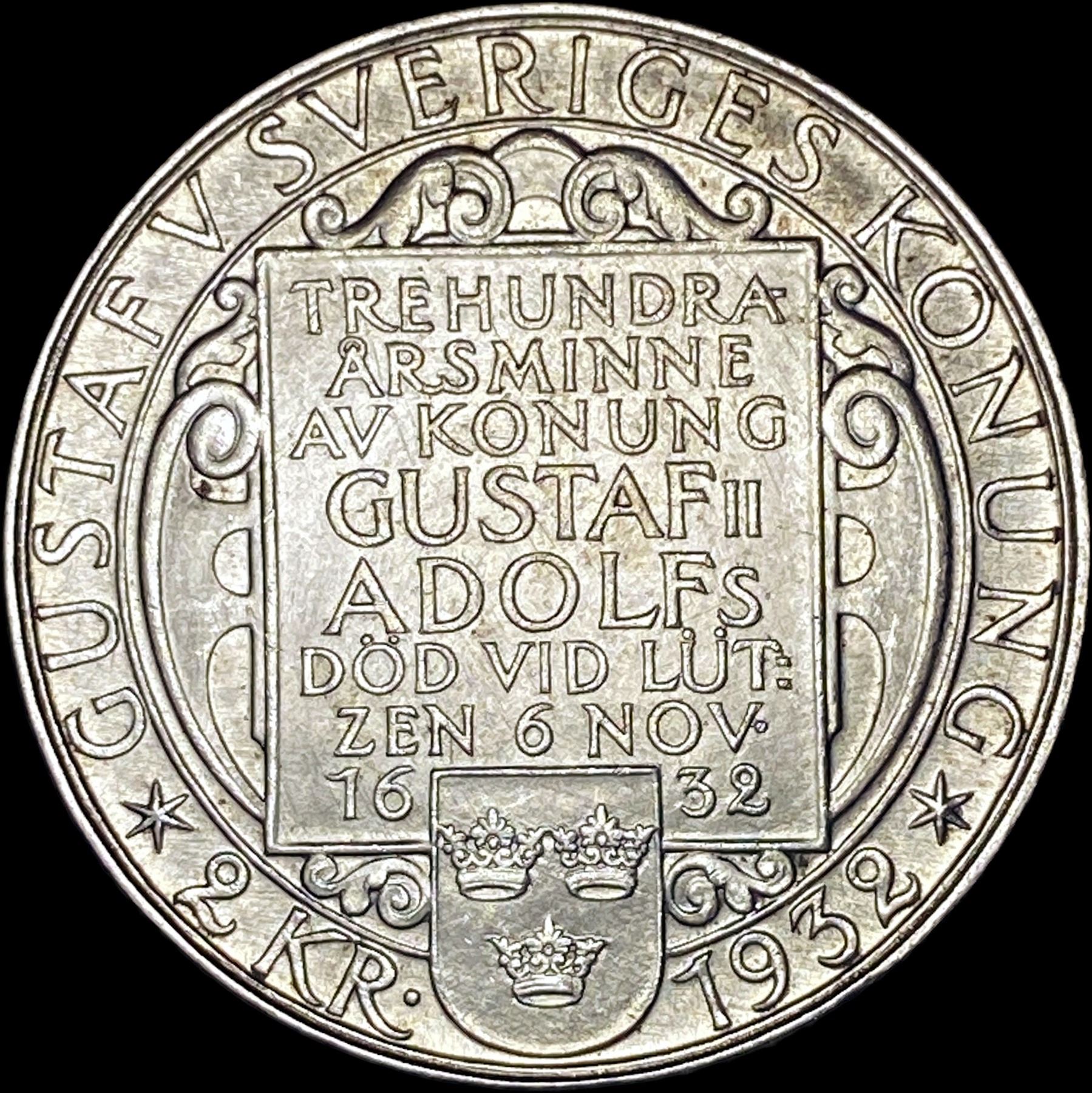 1932 Sweden Gustaf II Silver 2 Kronor UNCIRCULATED