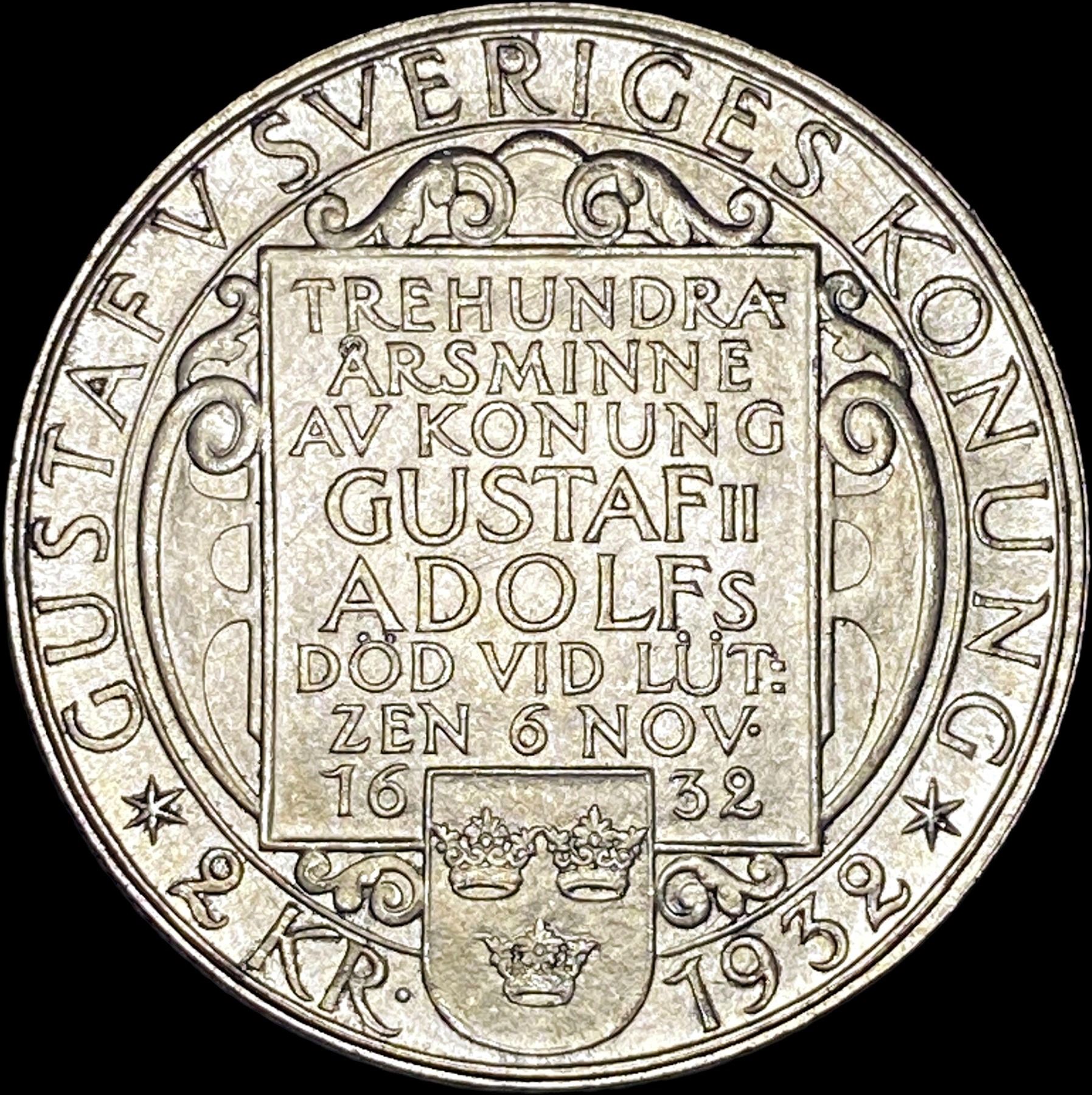 1932 Sweden Gustaf II Silver 2 Kronor UNCIRCULATED