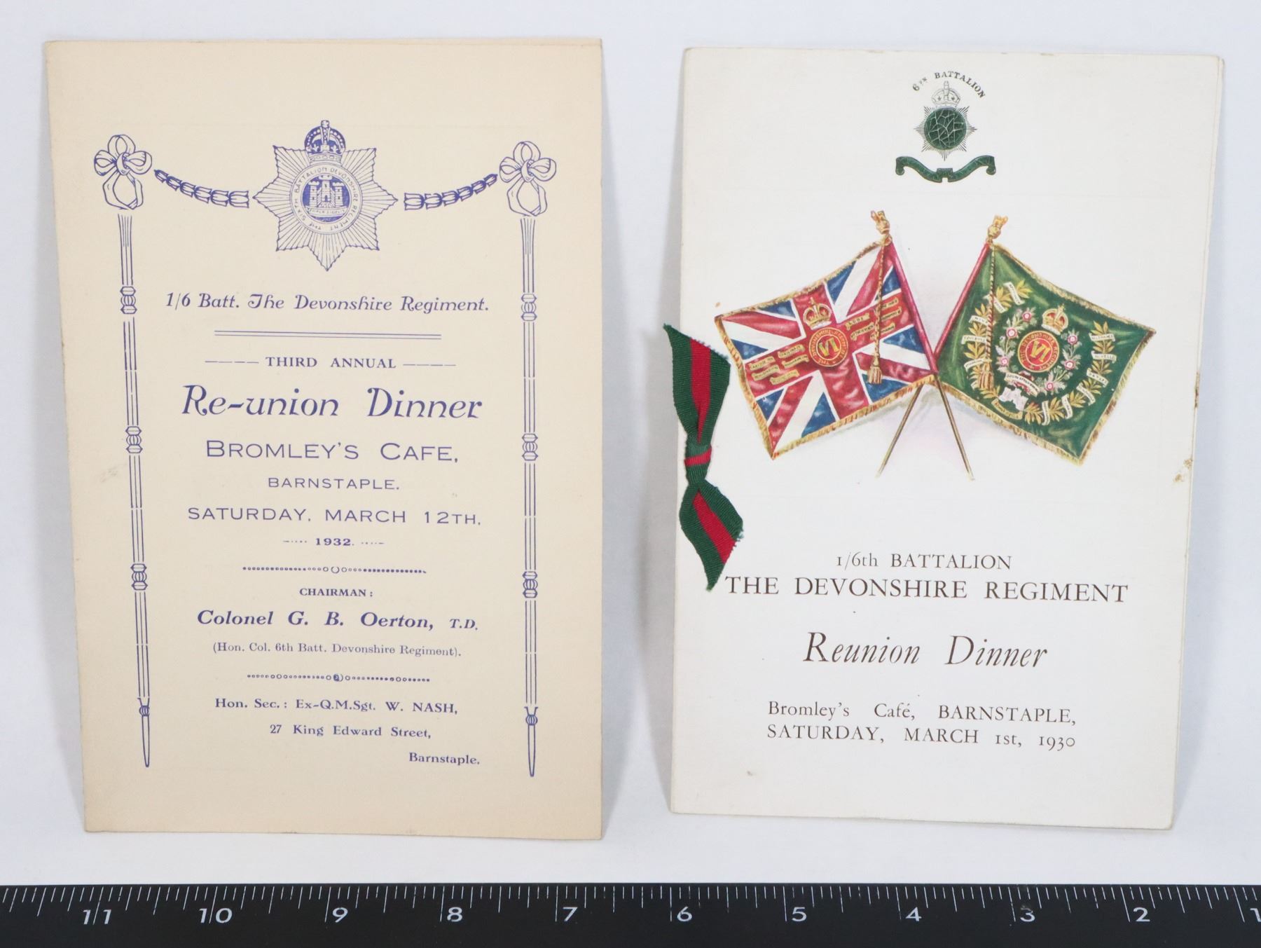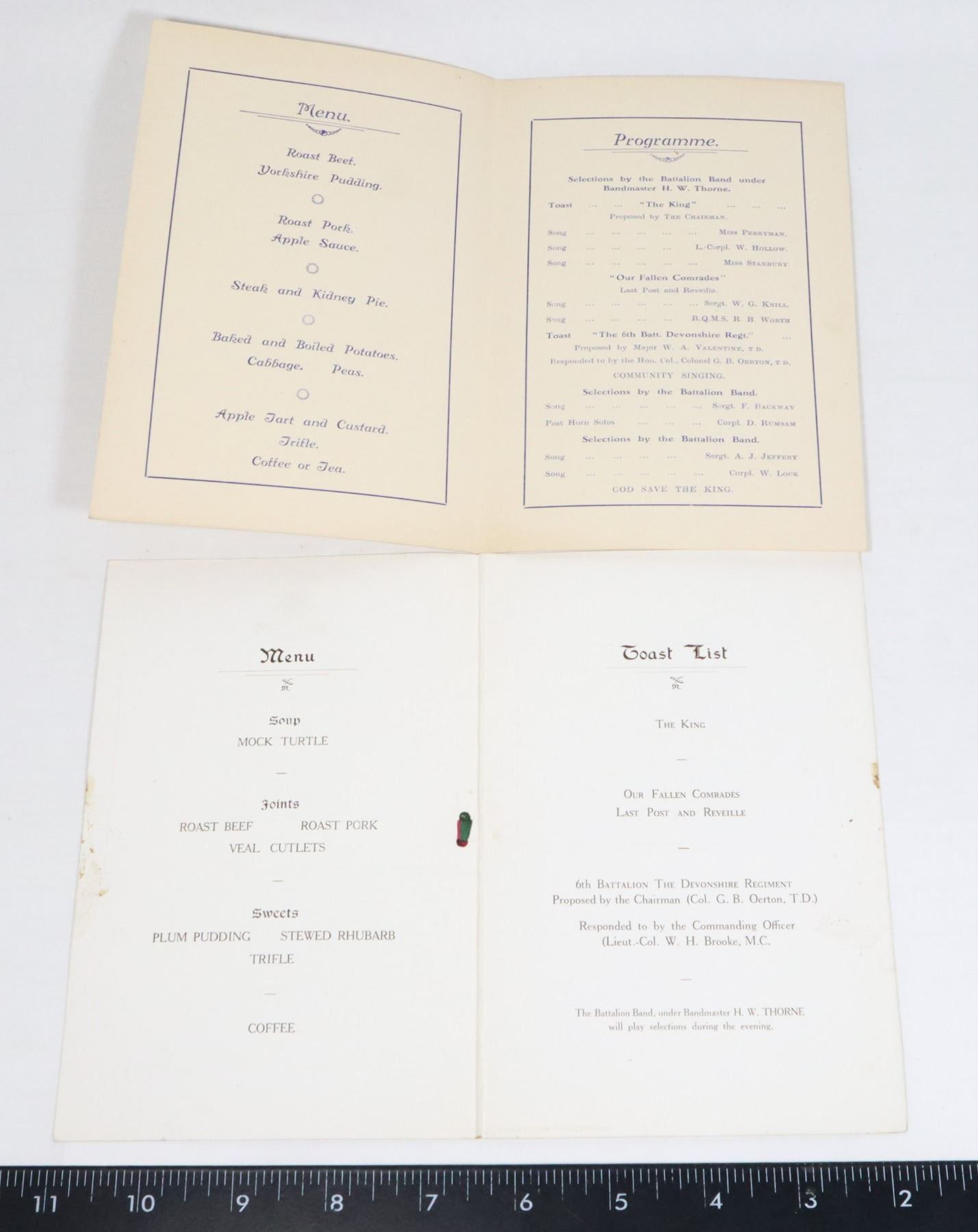 DEVONSHIRE REGIMENT FOOD MENU EPHEMERA BRITISH MILITARY AND 1930 WW1 REUNION DINNER CARD DEVONSHIRE 1/6TH DEVONSHIRE REGIMENT FOOD MENU EPHEMERA BRITISH MILITARY