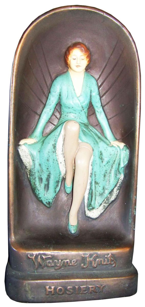 1932 Wayne Knits Hosiery Plaster Store Display Figure. The Wayne Knitting Mills Co., Chicago, IL. Beautiful large figure. Some minor paint rubbing to the legs otherwise Very Good Condition. 20 inches tall.