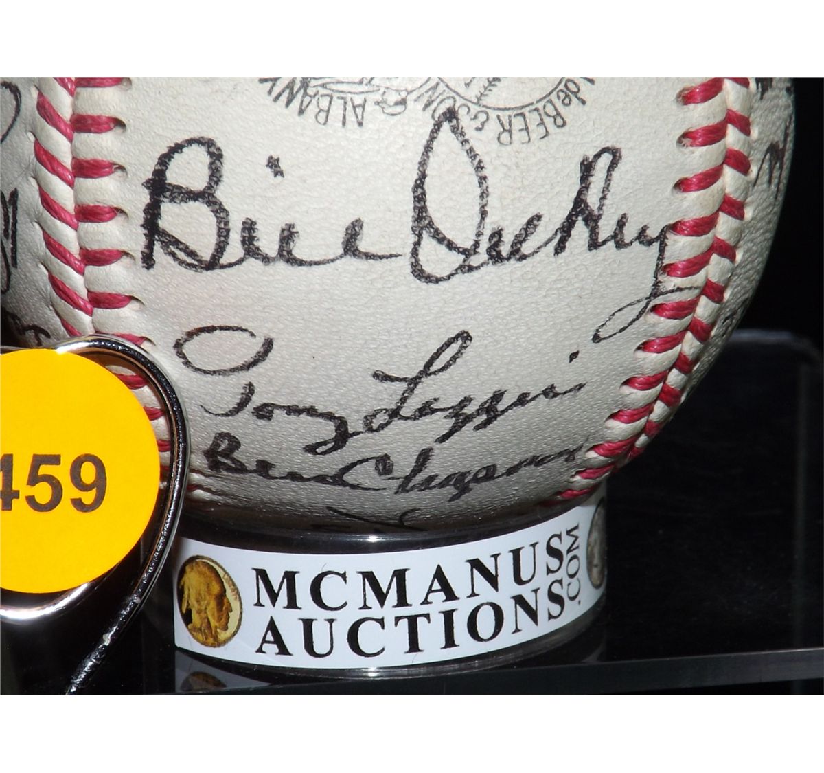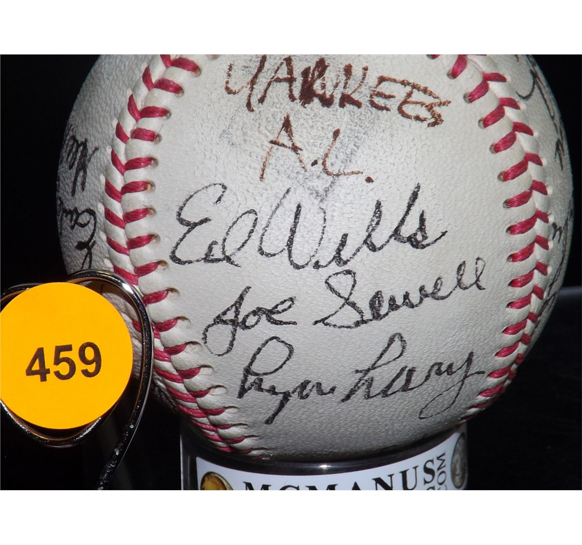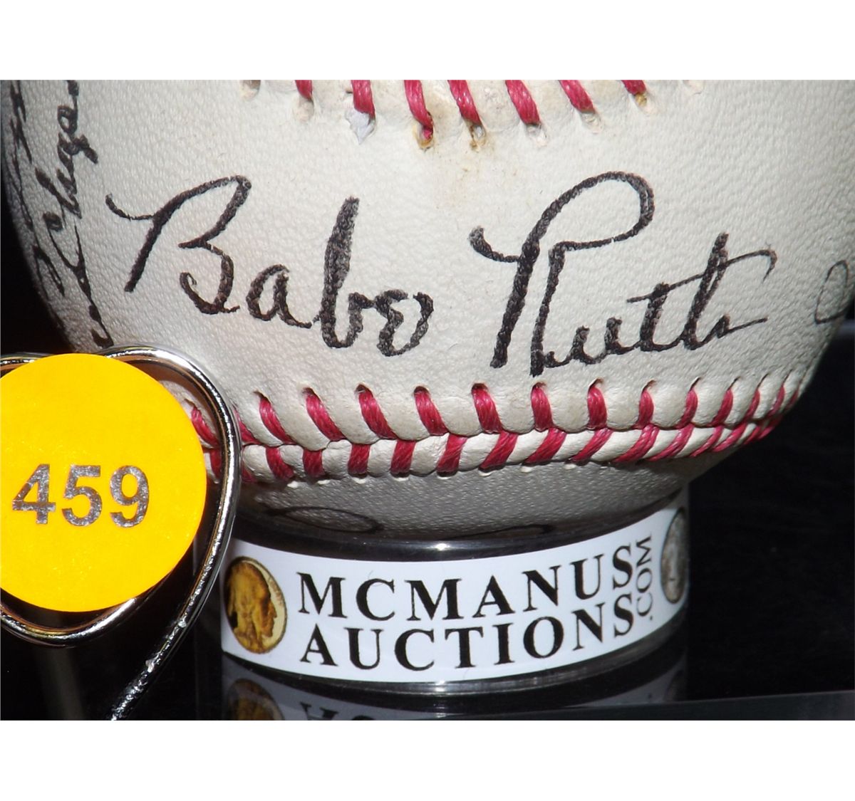 1932 Yankees Autographed Baseball. J. deBeer and Son Double Header Ball Signed by: Ed Wells, Joe Sewell, Lyn Lary, Babe Ruth, Bill Dickey, Tony Lazzeri, Ben Chapman, Charles"Red" Ruffing, Earle Combs, George Pipgras, Lou Gherig, Dusty Rhodes, Art Jorgens and Herb Pennock. Appraised or estimated retail value $140,000. COA by Christopher Morales. All Sales Final. Please see terms and conditions of auction.