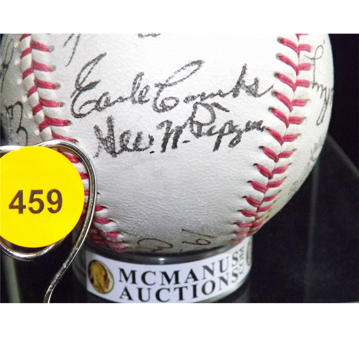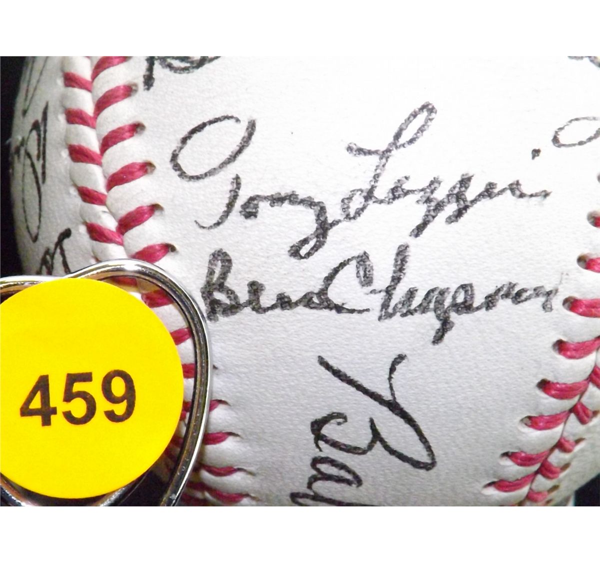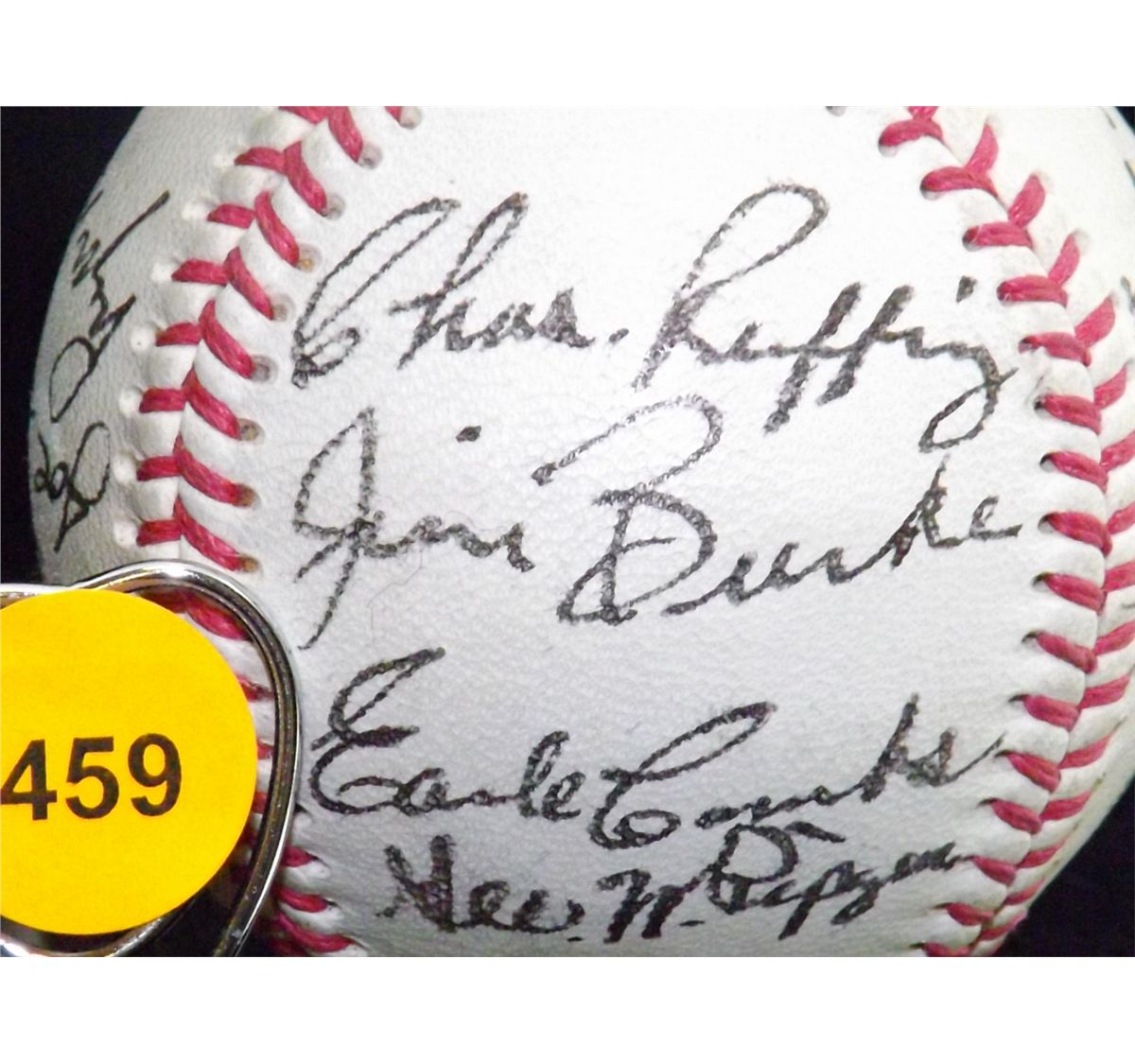 1932 Yankees Autographed Baseball. J. deBeer and Son Double Header Ball Signed by: Ed Wells, Joe Sewell, Lyn Lary, Babe Ruth, Bill Dickey, Tony Lazzeri, Ben Chapman, Charles"Red" Ruffing, Earle Combs, George Pipgras, Lou Gherig, Dusty Rhodes, Art Jorgens and Herb Pennock. Appraised or estimated retail value $140,000. COA by Christopher Morales. All Sales Final. Please see terms and conditions of auction.