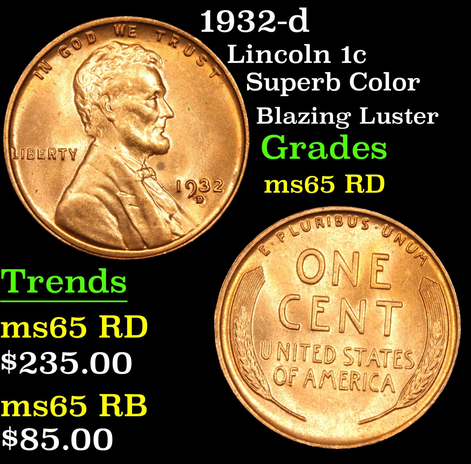 1932-d Lincoln Cent 1c Grades GEM Unc RD. Superb Color; Blazing Luster