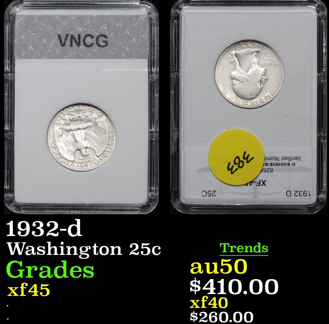 1932-d Washington Quarter 25c Graded xf45 By VNCG. According to David Hall, from PCGS The 1932-D is by far the rarest of the Washington quarters. There are only two Washington quarters with mintages of under one million coins. The 1932-D has an original mintage of 436,800. This coin has been highly sought after in all grades for the past 60 years. This is one of the key dates of the Washington quarter series and one of the better known rare coins of the twentieth century. Very scarce Key Date. This is the key date to the seies, even more scarce than the 1932-s. Scarce in all grades.