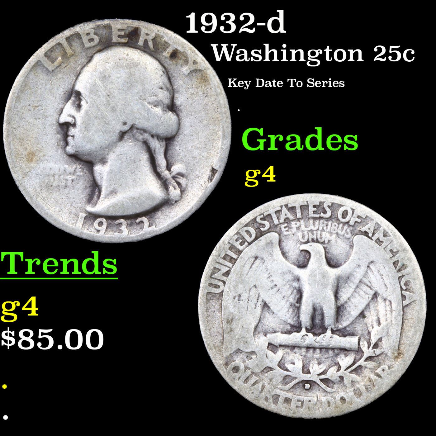 1932-d Washington Quarter 25c Grades g, good. According to David Hall, from PCGS The 1932-D is by far the rarest of the Washington quarters. There are only two Washington quarters with mintages of under one million coins. The 1932-D has an original mintage of 436,800. This coin has been highly sought after in all grades for the past 60 years. This is one of the key dates of the Washington quarter series and one of the better known rare coins of the twentieth century. Very scarce Key Date. This is the key date to the seies, even more scarce than the 1932-s. Scarce in all grades.