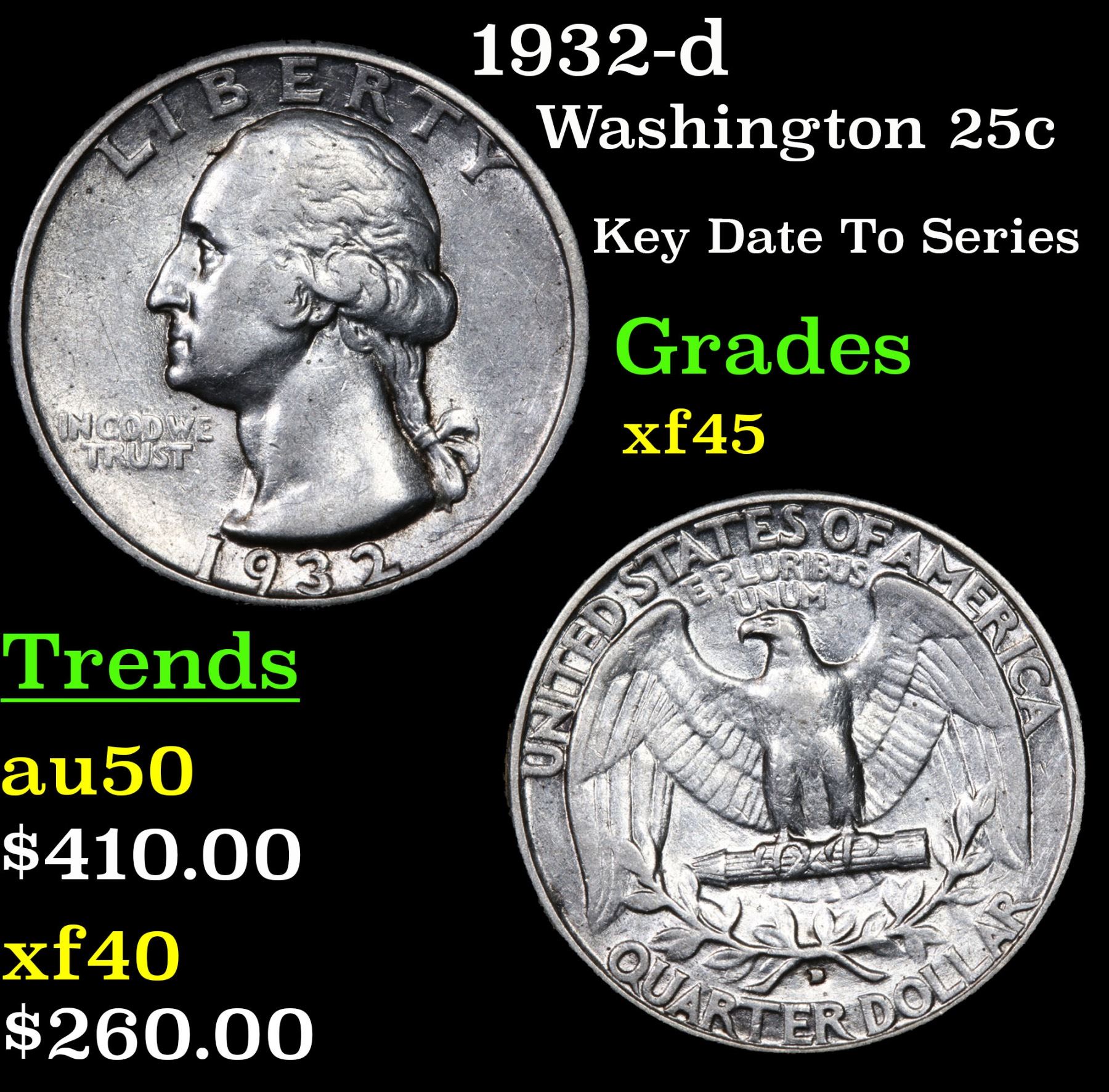 1932-d Key Date To Series . Washington Quarter 25c Grades xf+. According to David Hall, from PCGS The 1932-D is by far the rarest of the Washington quarters. There are only two Washington quarters with mintages of under one million coins. The 1932-D has an original mintage of 436,800. This coin has been highly sought after in all grades for the past 60 years. This is one of the key dates of the Washington quarter series and one of the better known rare coins of the twentieth century. Very scarce Key Date. This is the key date to the seies, even more scarce than the 1932-s. Scarce in all grades.