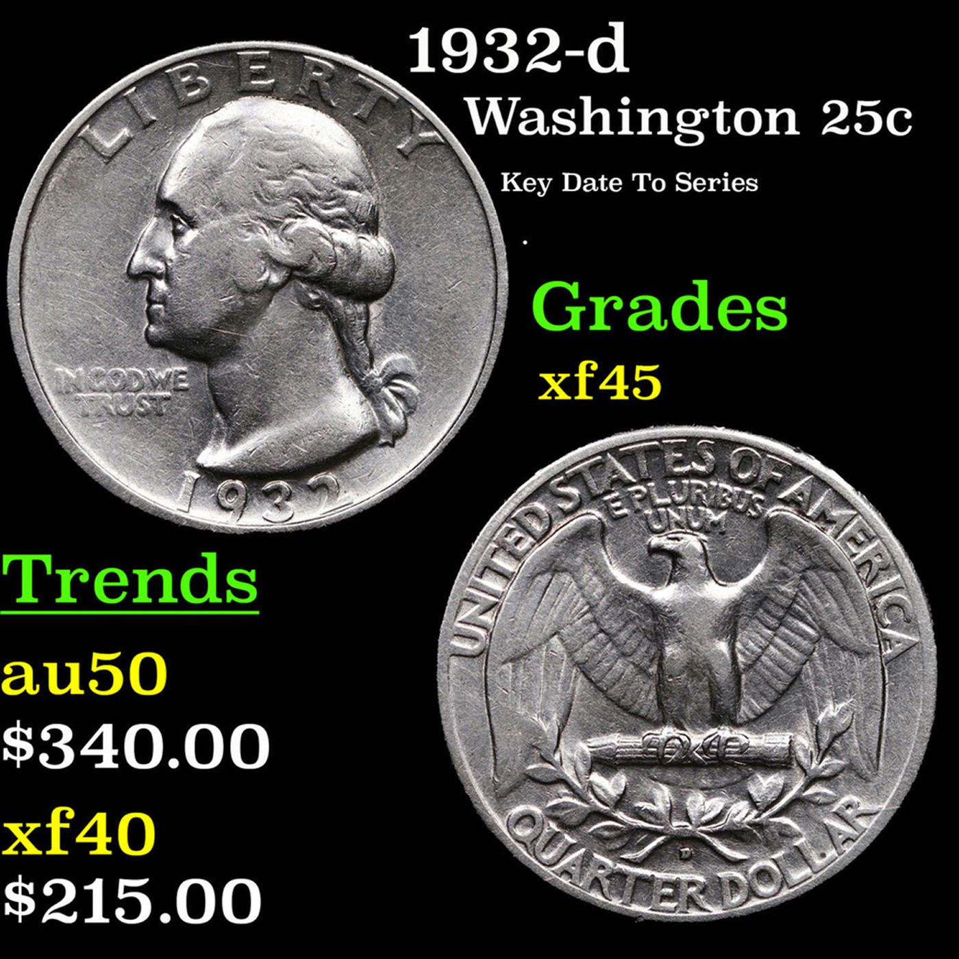 1932-d Washington Quarter 25c Grades xf+. According to David Hall, from PCGS The 1932-D is by far the rarest of the Washington quarters. There are only two Washington quarters with mintages of under one million coins. The 1932-D has an original mintage of 436,800. This coin has been highly sought after in all grades for the past 60 years. This is one of the key dates of the Washington quarter series and one of the better known rare coins of the twentieth century. Very scarce Key Date. This is the key date to the seies, even more scarce than the 1932-s. Scarce in all grades.