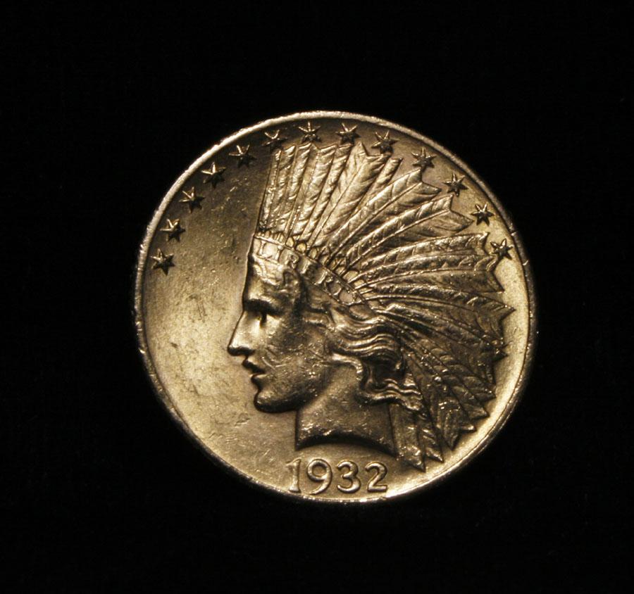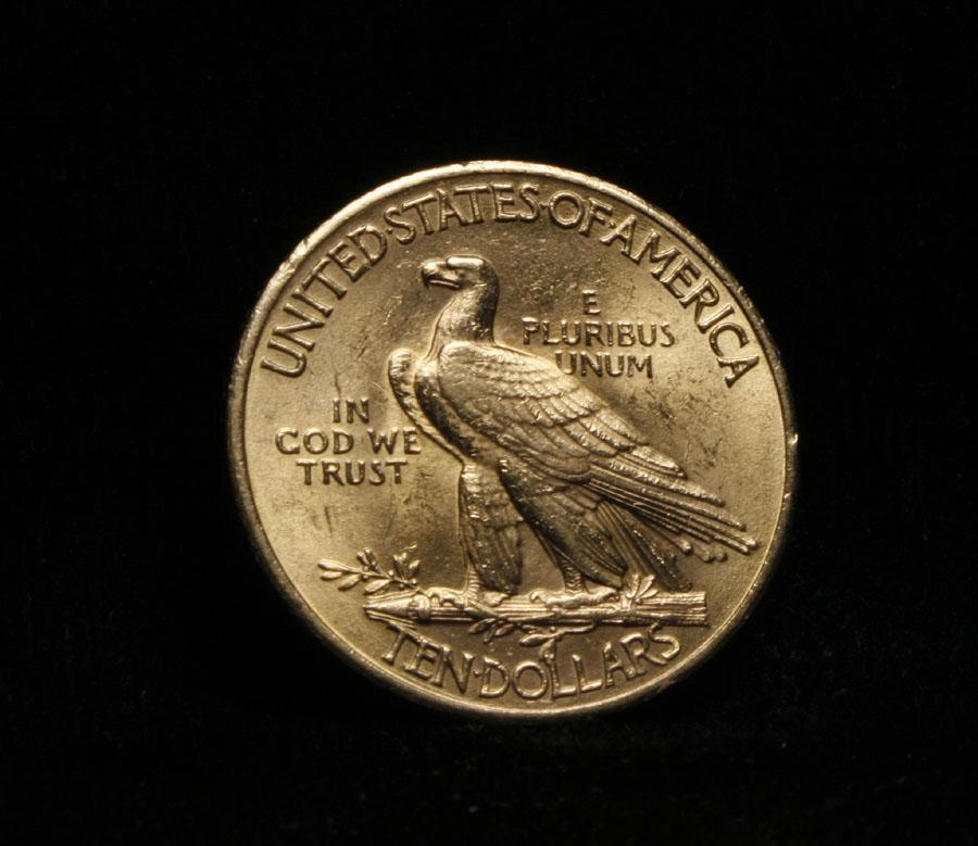 Nice lustrous example. Good Eye Appeal. Sharp features. Some bag marks on the cheek keep this great coin to an ms63. The $10 Indian, the last coin designed by St. Gaudens before his death, depicts a female Lady Liberty, Possibly his wife, wearing an Indian War Bonnet. This is a nice example of a beautifully designed coin. Coin World's Coin Values lists ms63 at $1750 and The Wholesale Greysheet lists ms63 at $1150. Estimated Value $1250.