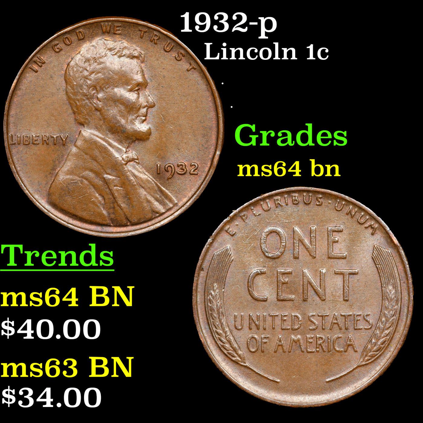 1932-p Lincoln Cent 1c Grades Choice Unc BN.