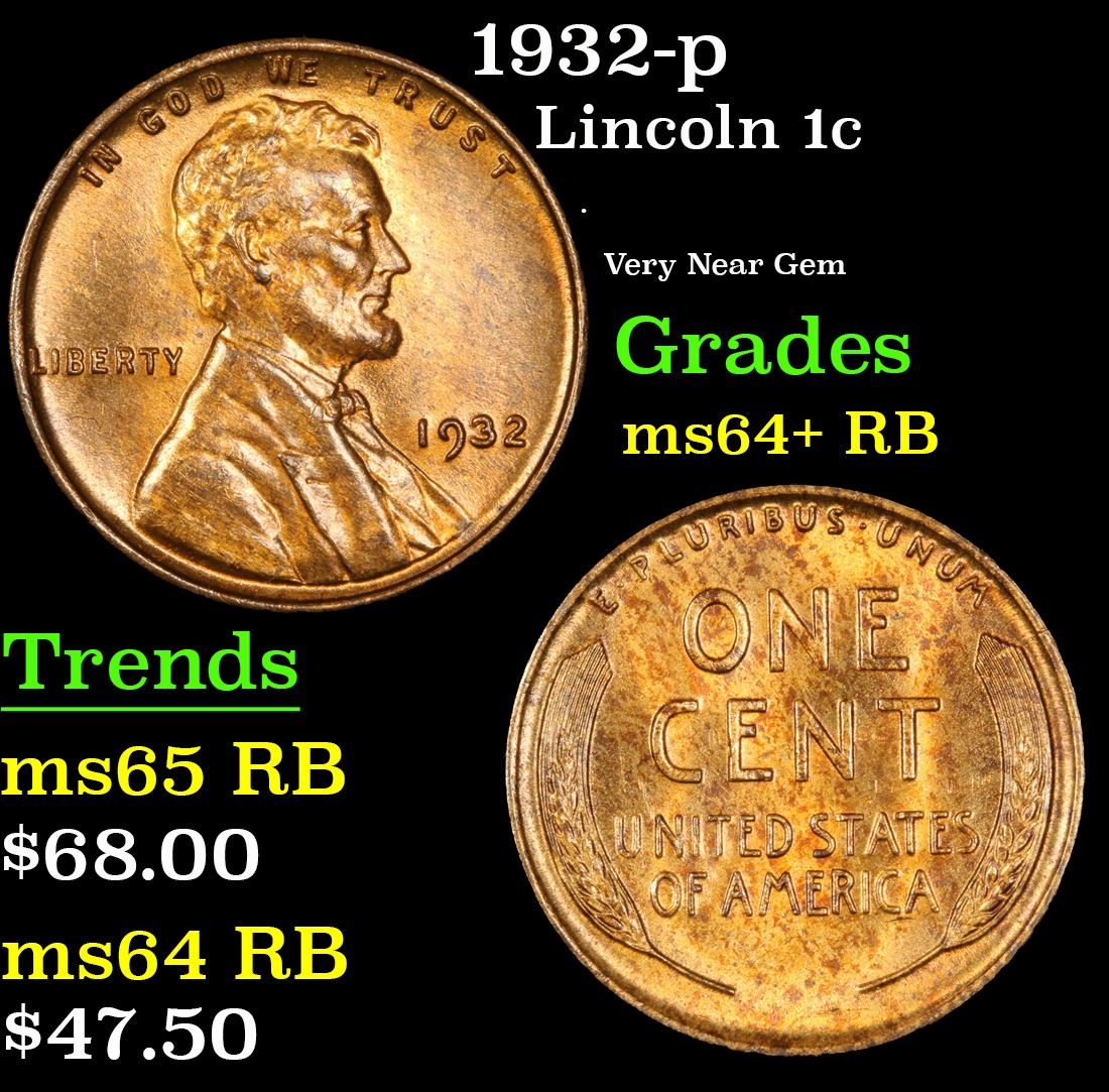 1932-p . Very Near Gem Lincoln Cent 1c Grades Choice+ Unc RB.