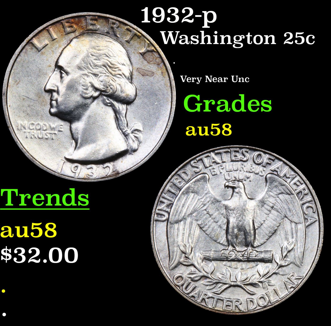 1932-p Washington Quarter 25c Grades Choice AU/BU Slider.